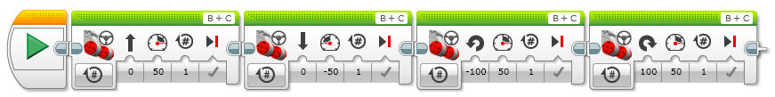 For example, to make a standard two-wheeled robot carry out a series of movements, we can drag out the required action blocks, arranging them as desired, from left to right. Each block is executed one at a time, all the way until the end of the program. We call this purely sequential approach the simple design pattern.