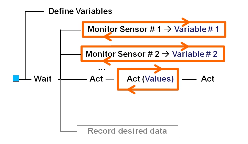 This enables the main program branch to act based on the variables, or as shown in the diagram, to Act(values) or Act, as a function of variable values.